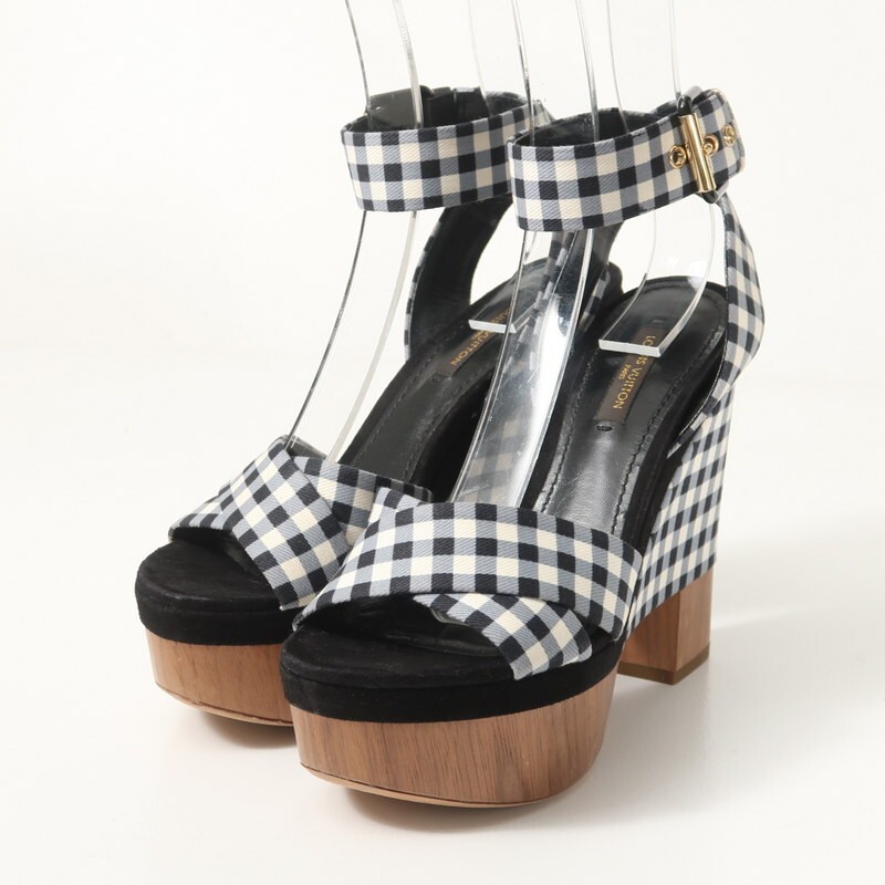 - MI2208△伊製 LOUIS VUITTON ルイヴィトン ギンガムチェック ウッド/ウェッジソール プラットフォーム ストラップ サンダル 36(23.0cm相当)