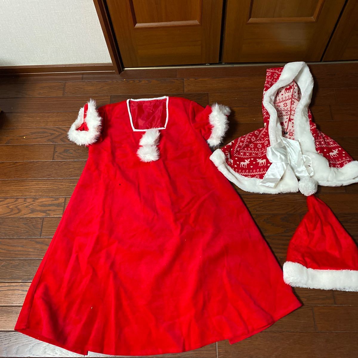 - 【M】中古サンタワンピースと帽子と頭巾、新品ストッキング3足