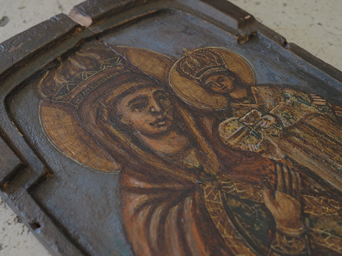 > J12221. ルーマニア アンティーク 18世紀 聖母子像のイコン 板絵 / トランシルヴァニア マリア像 キリスト教 宗教画 古道具 西洋骨董 時代