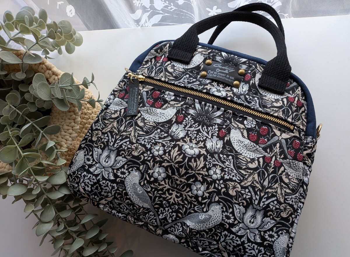 - ハンドメイドバッグ☆台形型トート☆ウイリアムモリス・いちご泥棒・オックス☆ネイビー11号帆布