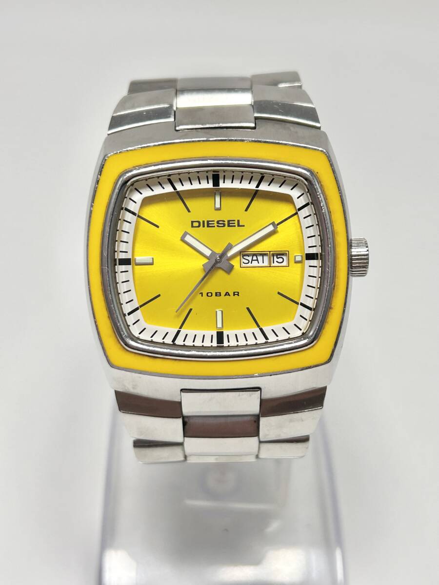 > ML882【RUP】★1円~★ 稼働品 DIESEL ディーゼル DZ-4062 クォーツ QZ イエロー文字盤 デイデイト スクエア シルバー SS メンズ腕時計