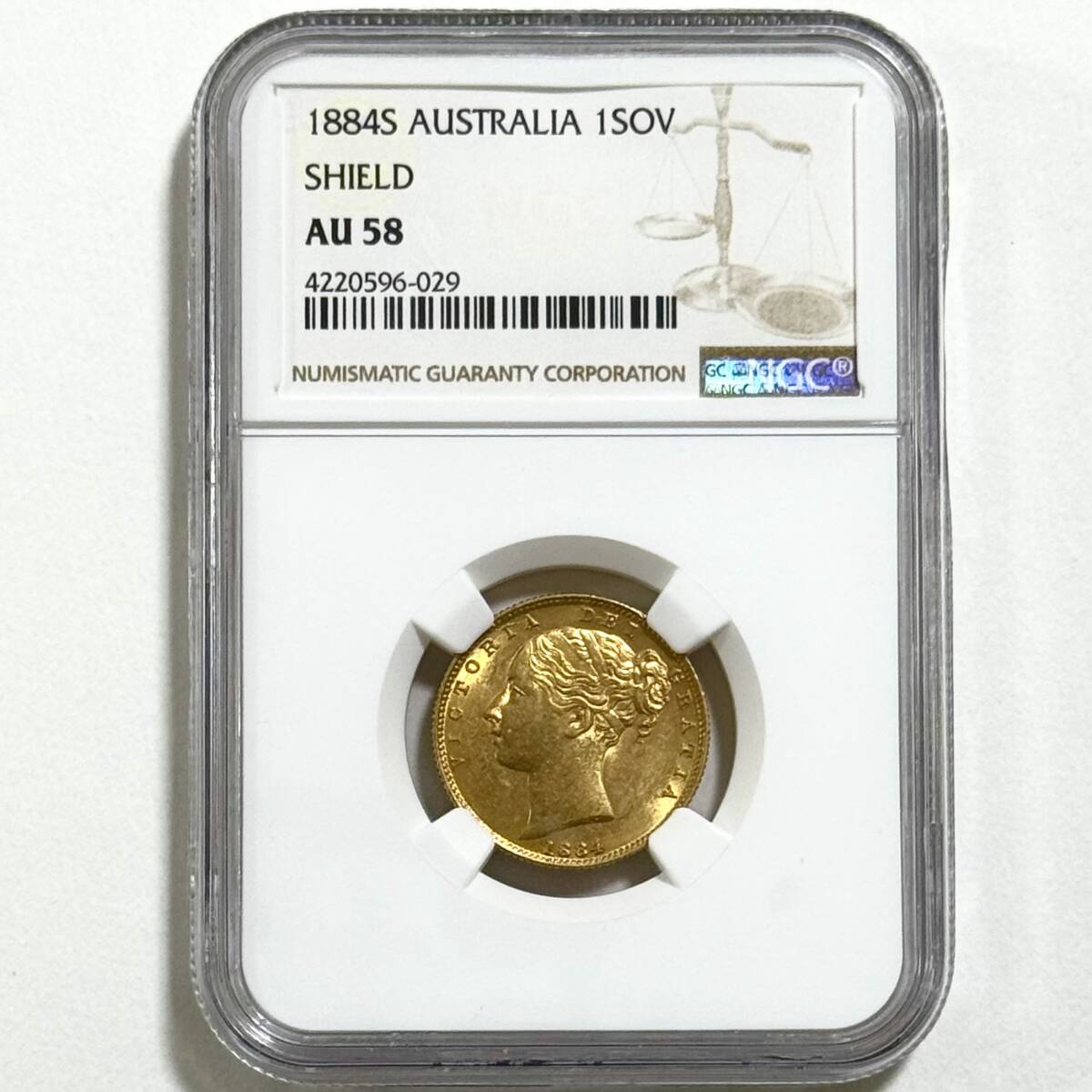 > 【NGC鑑定済】AU58高評価品☆オーストラリア1884年銘☆ビクトリア ソブリン金貨☆ヤングヘッド☆ミントマークSシドニー鋳☆レア!!