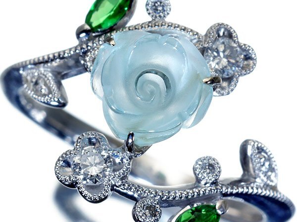 > 1円~【ジュエリー極】青い薔薇咲く!薔薇彫刻天然ブルートパーズ1.55ct&Gガーネット&ダイヤ 高級K18WGリング k1653ro【送料無料】