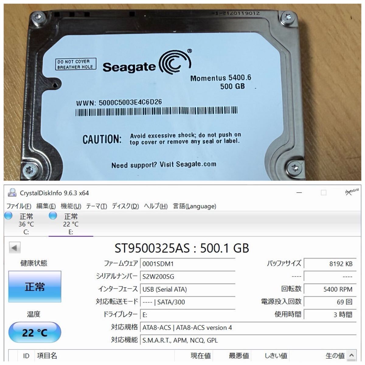 > ■500GB Seagate SATA 2.5インチHDD ST9500325AS ▲使用時間 3時間● 動作確認済