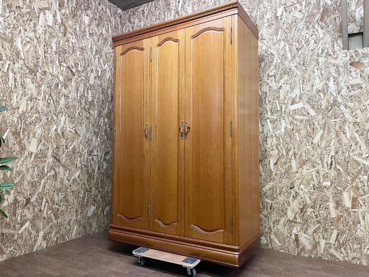 > ●府中家具 伝統工芸師 皿田卓人作 3面扉ワードローブ クローゼット 洋服掛け 収納家具 桐 箪笥 タンス チーク材 ミラー付き(貝982)