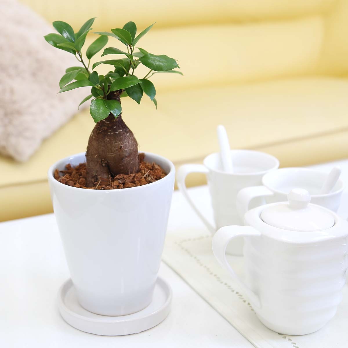 - 幸せを見守る樹 ガジュマル 5号 ホワイト陶器鉢 丸ロング 1鉢 土の表面 ウッドチップ|観葉植物 風水 ギフト