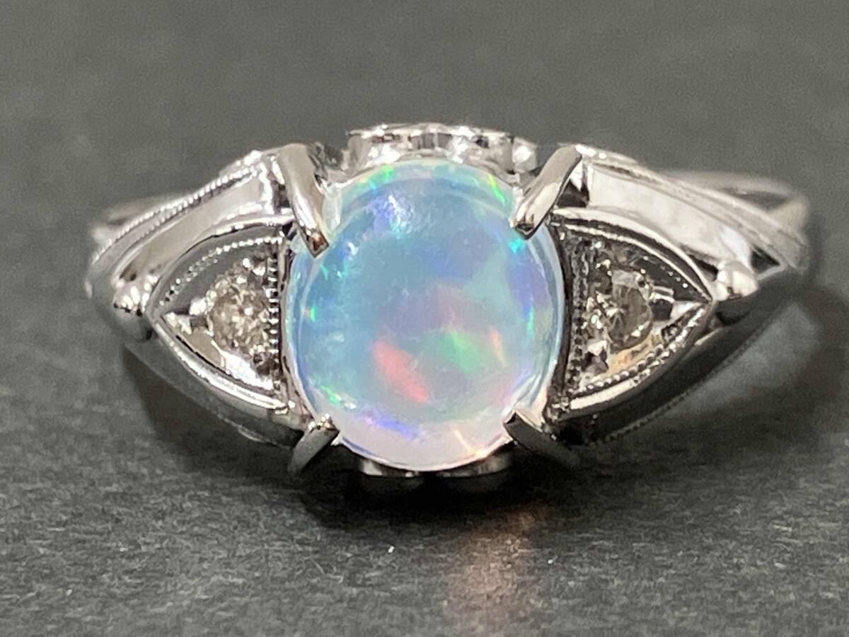 > 【鑑別カード付/クリーニング済】K14WG 天然ウォーターオパール 天然ダイヤモンド 約10号 レトロ デザイン ホワイトゴールド リング