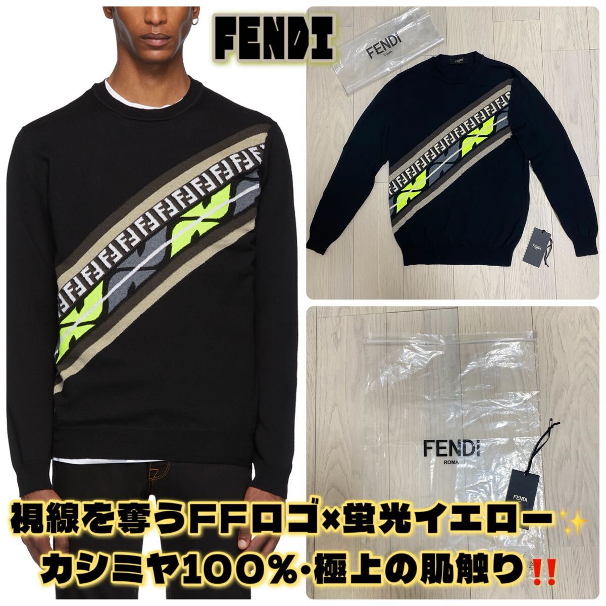 - FENDI フェンディ カシミヤ100% クルーネックニット FFロゴ 斜めライン 蛍光イエロー ブラック 44 タグ付き ニット セーター ロゴ