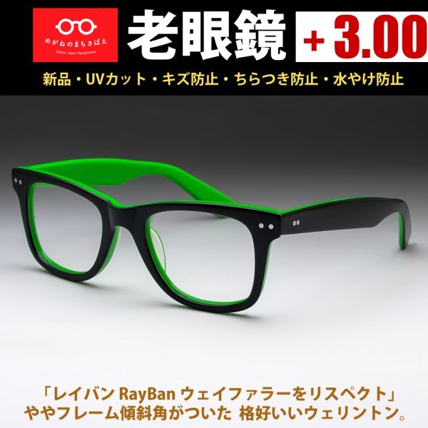 - 老眼鏡 +3.00 鯖江メガネ ウェリントン ウェイファラー仕様 視力補正 薄型レンズ付き シニアグラス 読書用メガネ 度付き可 AK101新品