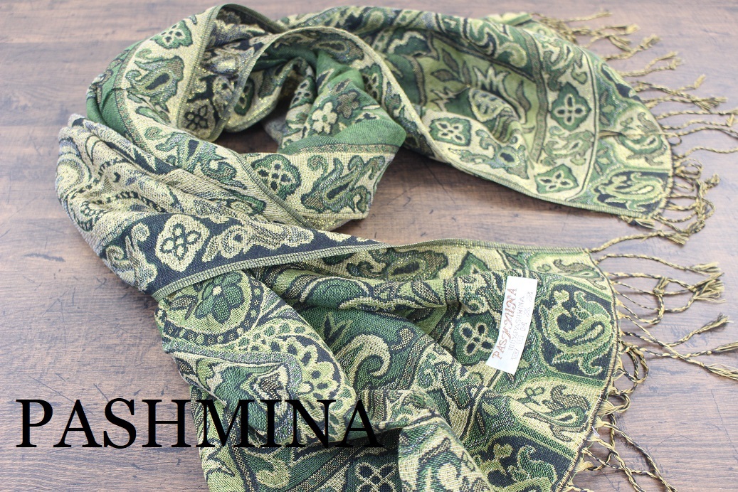 > 新品【パシュミナ Pashmina100%】金糸混 ペイズリー花柄 ピスタチオカラー 緑 GREEN ゴールド 金 GOLD 大判 ストール 訳あり