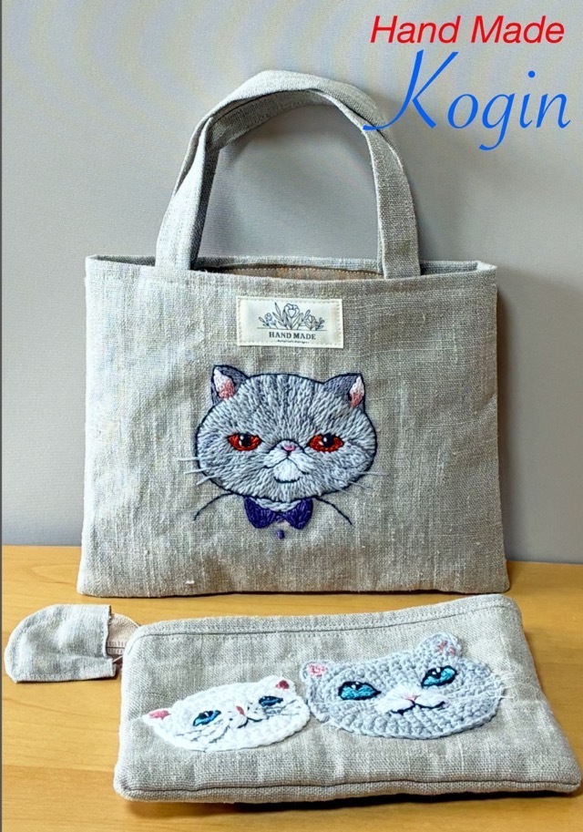- 猫ちゃんの刺繍リネンミニバック*ポーチ