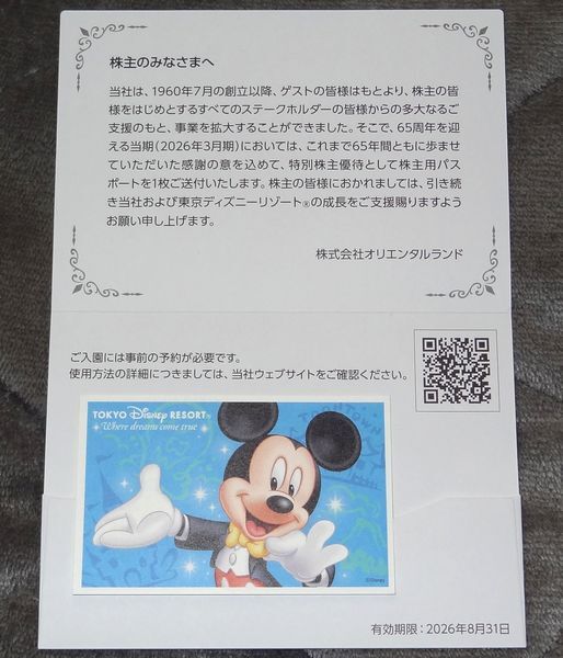 - 普通郵便送料無料◆オリエンタルランド特別株主優待◆東京ディズニーランド・東京ディズニーシー◆株主用パスポート 1枚 2026年8月31日まで