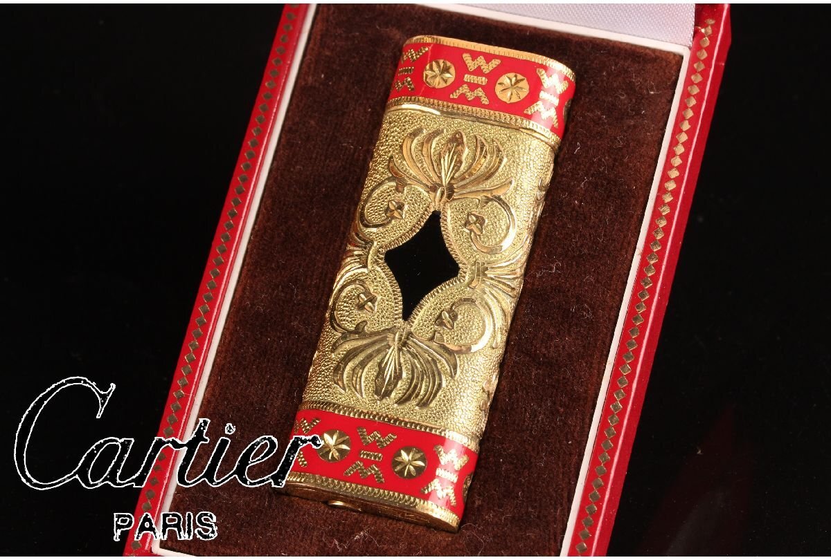 - [URA]ガス無/Cartier/カルティエ/ロイキング/ガスライター/ゴールド×レッド/約105.6g/4-4-01 (検索)骨董/煙草/喫煙具/たばこ/シガレット