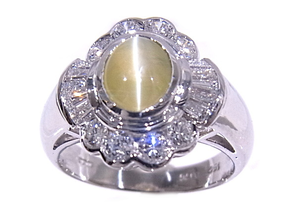 > Pt900 プラチナ 指輪 クリソベリルキャッツアイ ダイヤ ノーブランド リング 15号 【中古】【程度A+】 【極上美品】【新品仕上げ済】