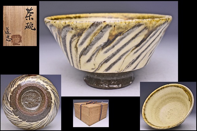 > 船木道忠 ★ 白釉 線文 茶碗 ★ 共箱 ★ 布志名焼 ★ 指きの様な力強い文様が素晴らしい逸品 ★ 民芸陶 茶道具 ★検 舩木研兒 船木伸児