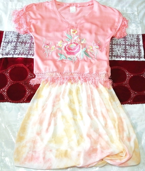 > ピンクフリンジ花刺繍チュニック ネグリジェ 淡いオレンジフレアスカート 2P Pink fringe flower tunic negligee orange flare skirt