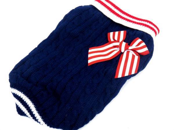 - 紺 XS 小型犬服 中型犬用 秋冬ニット 犬用服 首回り31cm 胸囲36cm 丈27cm 青 ネイビー ボーダー リボン 室内 散歩 ペット 新品 送料無料