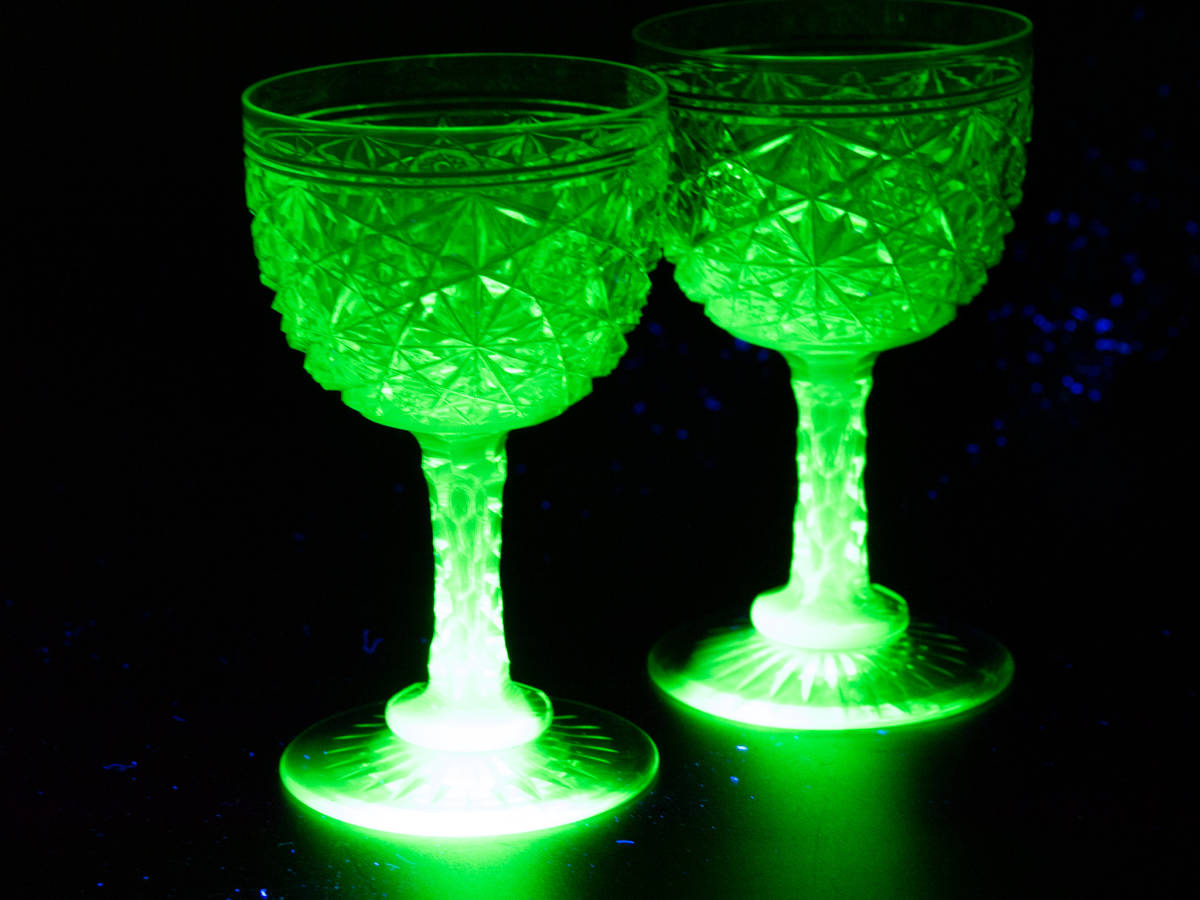 - 【値下げ交渉有り】 希少 珍品 アンティーク 江戸切子 ウランガラス 蜘蛛の巣菊繋ぎ 底菊文 グラス 2客