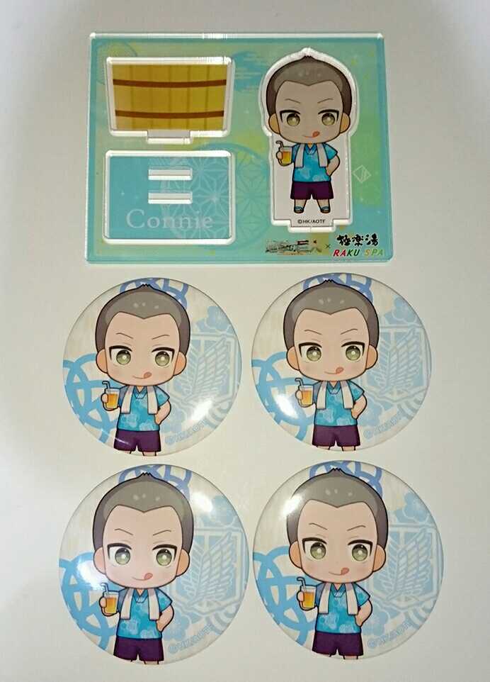 - ☆進撃の巨人※コニー※極楽湯※RAKU SPA※らくスパ※お風呂の民※アクリルスタンド※アクスタ※缶バッジ※5点セット☆