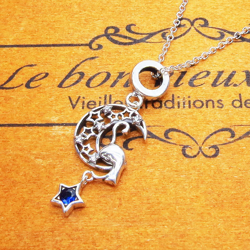 - シルバー925 三日月から星をとる仕草をした猫モチーフのペンダント・ネックレス ブルージルコン