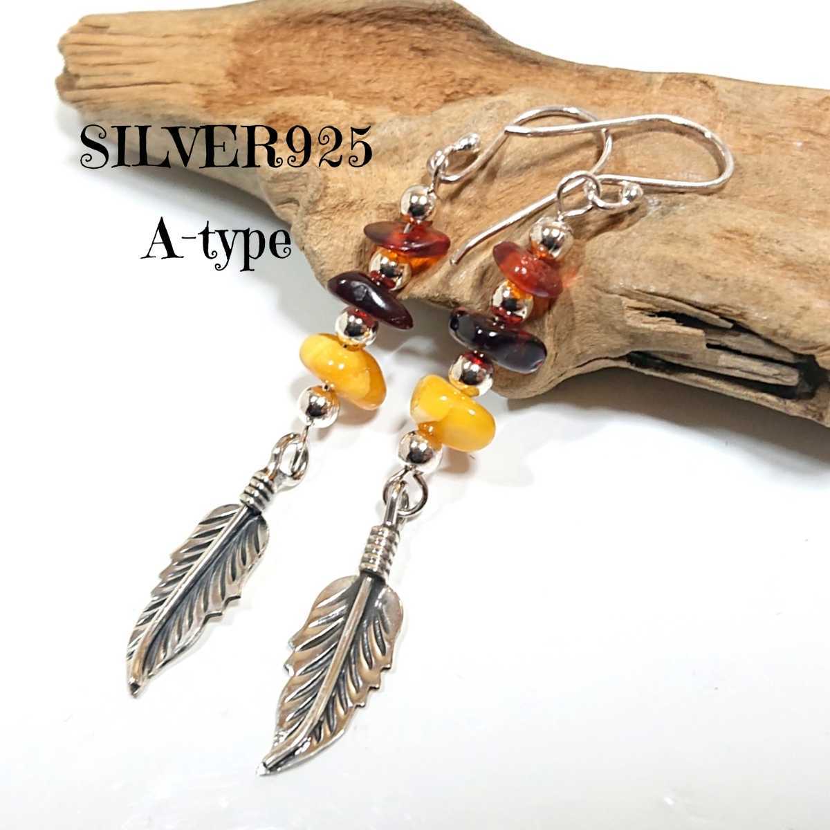 - 5440-A SILVER925 アンバーフェザーピアス シルバー925 琥珀 コハク 天然石 ロング インディアン オレンジ ハニー レッド 3色 綺麗な石