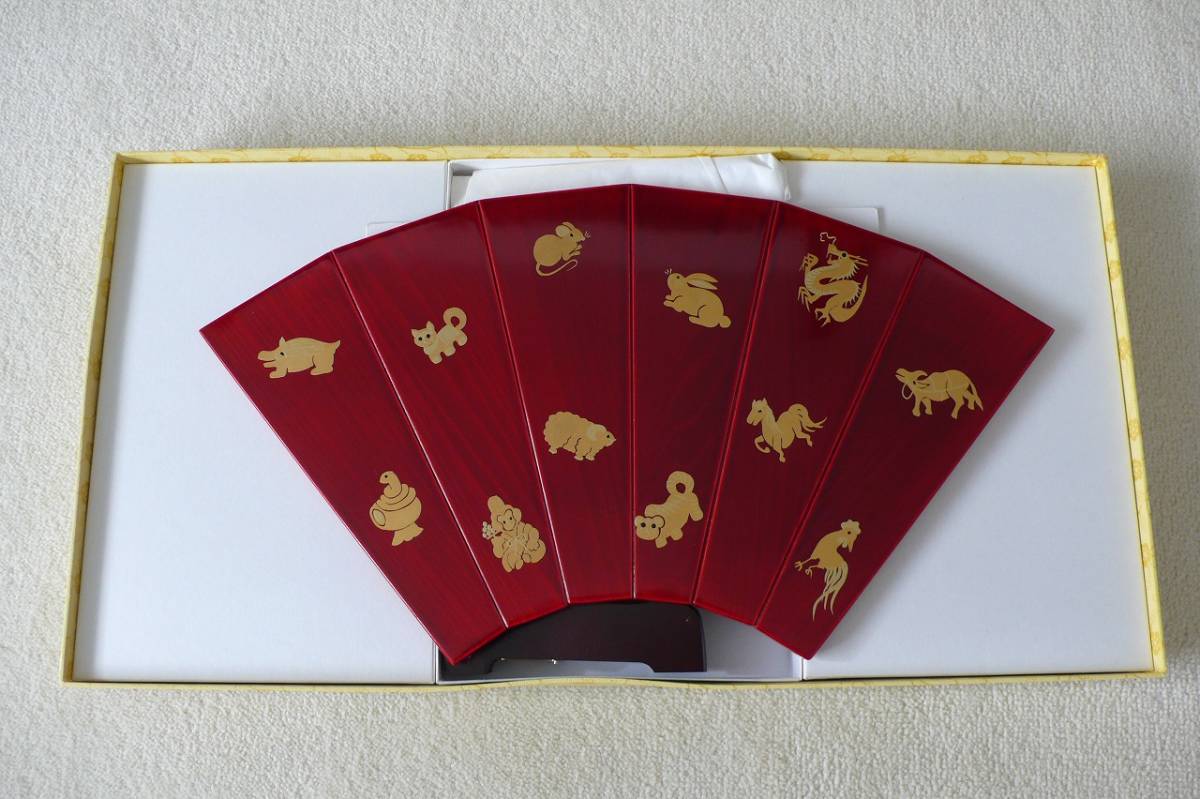 - 飛騨 春慶塗 干支・扇・置物・吉祥・縁起物・十二支揃い・叙勲記念品・未使用・高山