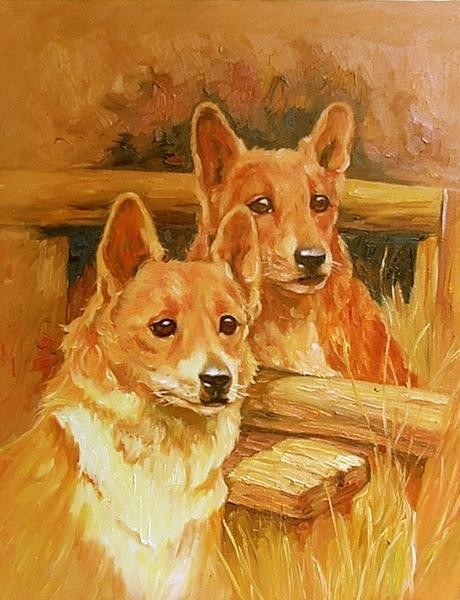 - 油絵 Arthur Wardleの名作_2匹のコーギー犬 ma509