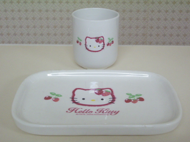 - 湯飲み 底部に少々難有◆ハローキティ 2000年製◆湯のみ & マルチ トレイ 陶器製 set◆イチゴ柄 湯呑み ランチプレート お皿 四角皿
