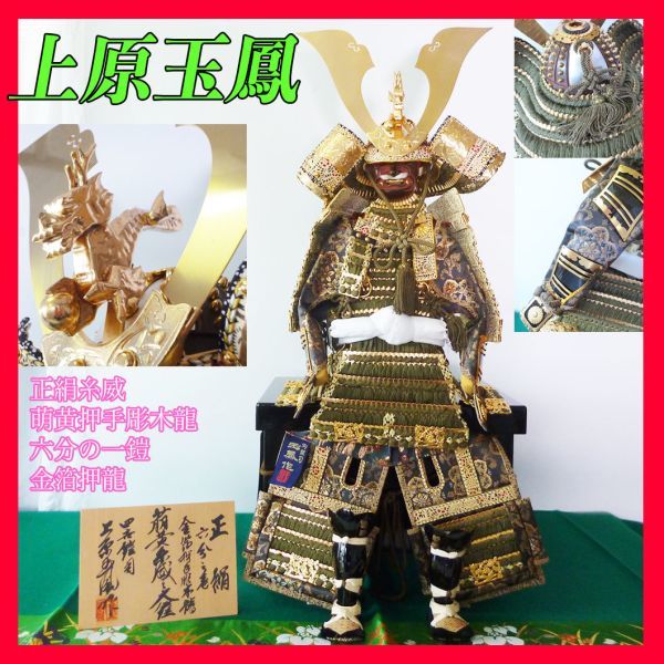 - 新品 名匠 上原玉鳳 大鎧 六分の壱 戦国武将鎧兜 名将 萌黄縅 正絹縅 金箔押手彫木彫龍 本金鍍金 豪華絢爛 床飾付 必見 五月人形_50