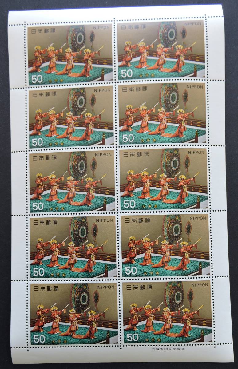 > 日本切手ー未使用1971年古典芸能シリーズ-2集(雅楽)50円*10枚 全面シート 1シート