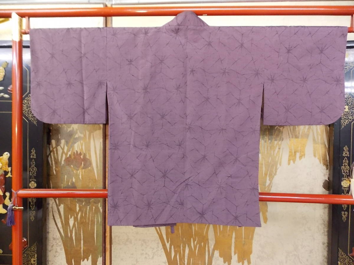 - きもの今昔3493 夏の100円バーゲン 引っ張りコート ポリエステル紬地 広衿濁り藤色共布紐仕立て