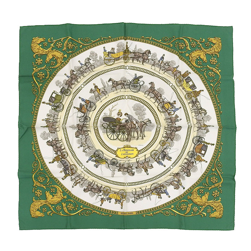- エルメス HERMES カレ90 スカーフ ロンシャンへの散歩 シルク100% グリーン系 中古 新入荷 HE0626