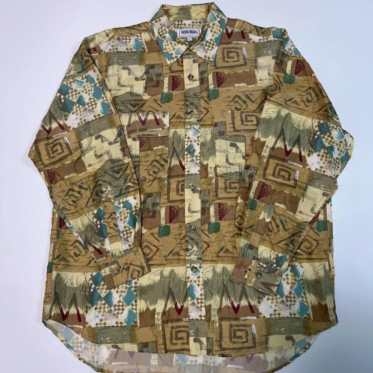 - FRIENDLY ORIGINAL 総柄 柄シャツ シルクシャツ レトロ アート ビンテージ ダブルポケット 長袖シャツ シルク100%