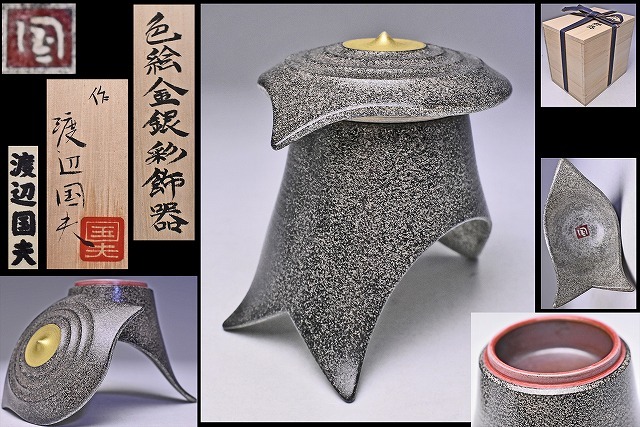 > 渡辺国夫 ★ 色絵 金銀彩 飾器 ★ 共箱 栞 ★ オブジェの様な楽しく洒落た造形の逸品 ★