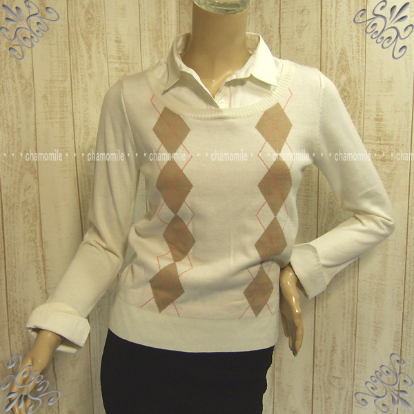 > 美品 Apuweiser-riche★アプワイザー・リッシェ★サイズ2 アーガイル柄 2way 長袖トップス 白 定番活用 重ね着 襟付/ざっくり丸首 切替type