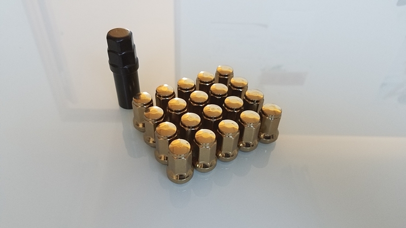 - ホイールナット ロックナット M12×P1.5 ゴールド スチール製 テーパー角60度 非貫通 七角形型 専用アダプター付 1台分セット