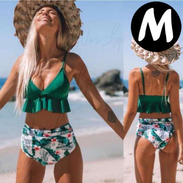 - おしゃれ!★インポート♪タンキニ★水着★ハイウエスト★M★フリル★水着★ボタニカル★グリーン★緑