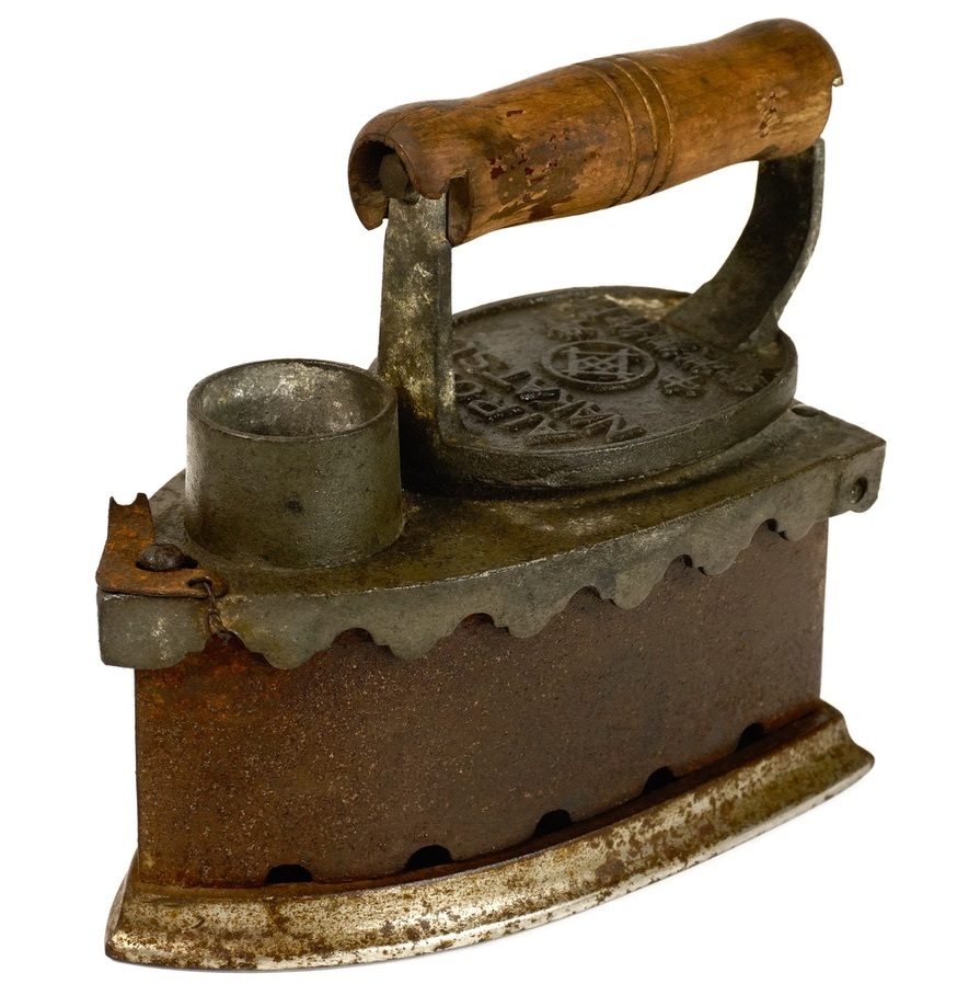 - 日本のアンティーク 鉄製炭火アイロン 古民具 中津 電桟製作所 幅17.5cm 高さ15.5cm 味わいたっぷりの逸品!ディスプレイにも素敵! TOT