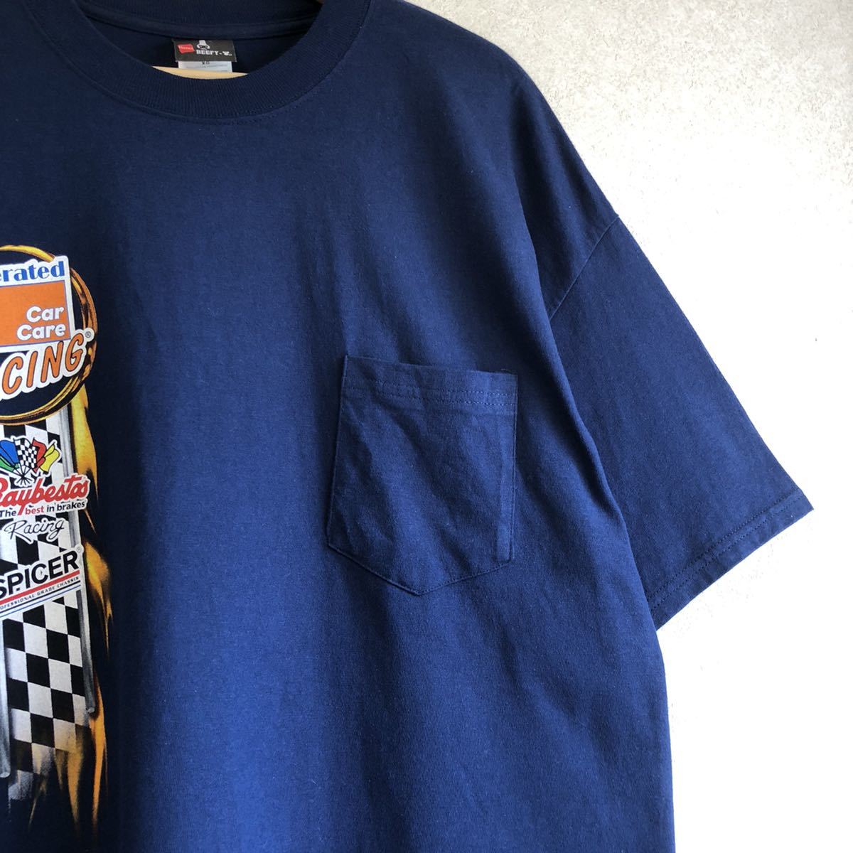 > XL☆ポケT レーシング カー プリント Tシャツ ネイビー Hanes Beefy 牛タグ オールド 90s 00s アメリカ US古着 ビンテージ ポケット付き