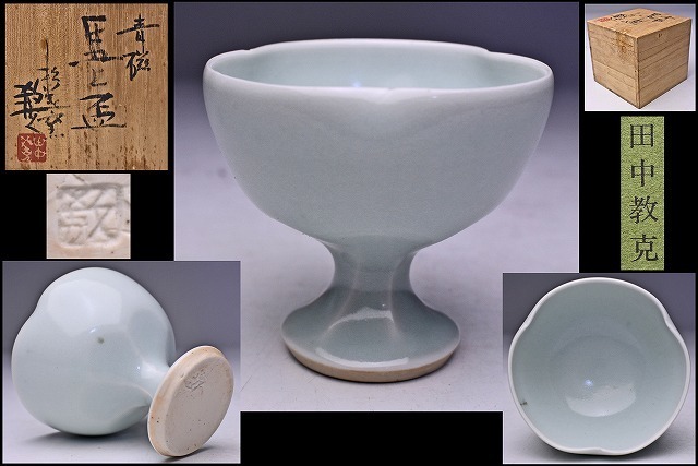 > 田中教克 ★ 青磁 馬上盃 ぐい呑 ★ 共箱 栞 ★ 師:河村蜻山★ 輪花足付の造形に気品が有り釉景の美しい逸品 ★ 酒器 ★ 笠間