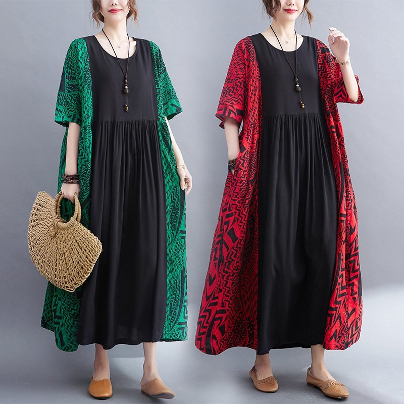 > ZJM1091 きいサイズ体型カバー*花柄切り替え*半袖マキシロングワンピース 新品春夏**レディース*カジュアル*ゆったり大