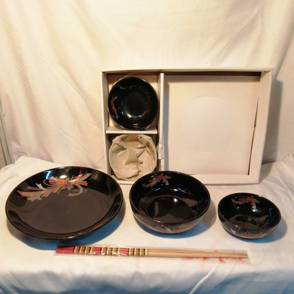 > 箱入未使用品 お皿 天ぷら そうめん アピテ 中皿1枚,22cm/深皿1枚,15.8cm/深小皿5枚,11cm 菜箸 さいばし 花 黒色