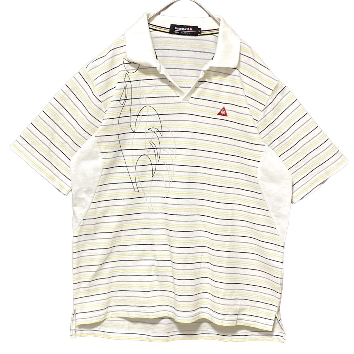 > 【ルコック ゴルフ】ボーダーポロシャツ Lサイズ デサント 鳥 刺繍 ゆったりボーダー柄 ゴルフウェア