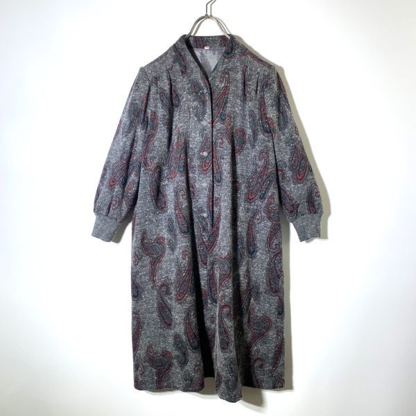 - 80s 90s レトロ ペイズリー 総柄 グレー ワンピース ノーカラー 昭和レトロ ビンテージ おしゃれ ワンピ サイズ11号 デザイン抜群 匿名配送