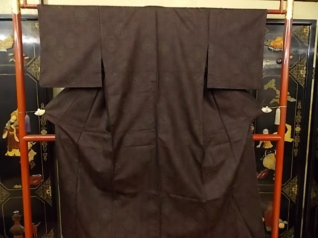 > きもの今昔4257 紬単衣のきもの 広衿セブセ付き仕立 黒地に臙脂色絣の麻の葉柄 華紋飛び柄入り 身丈143cm