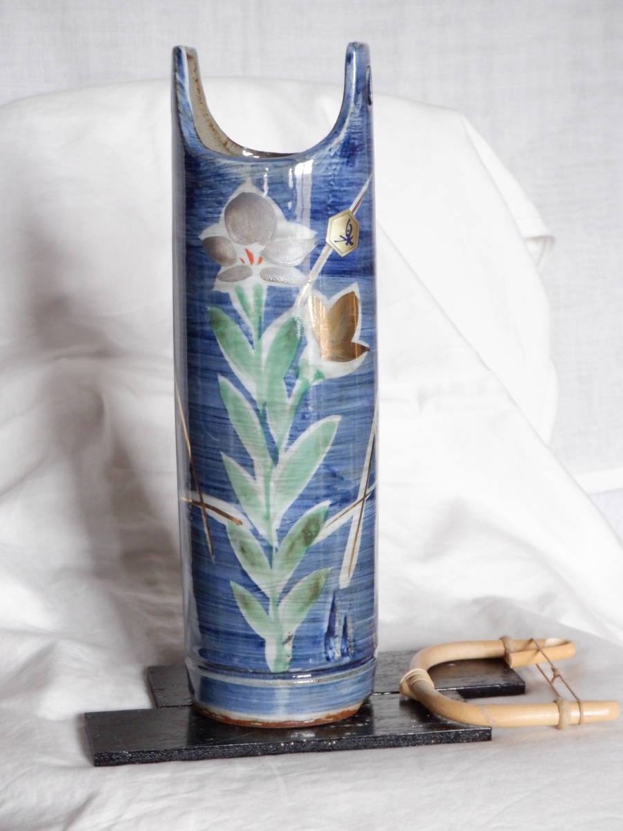 - 有田焼 幸泉作 花瓶 花器 桔梗の絵柄 置台付き 木箱入り 説明書付き 未使用品