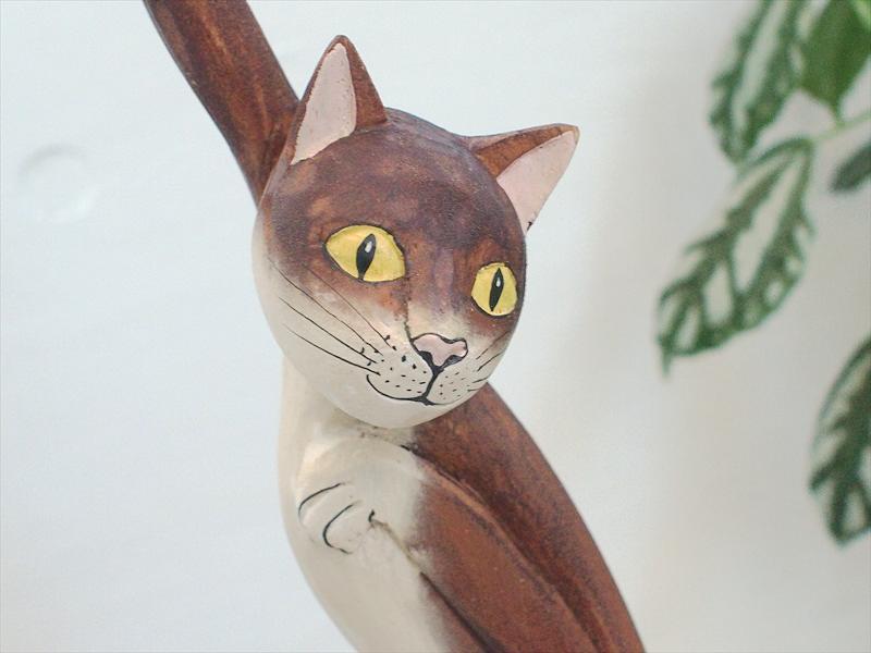 > ビンテージバリ島面白木彫*細長ちょっとセクシーポーズな猫キャンドルスタンド・茶・J☆飾り置物ディスプレイ