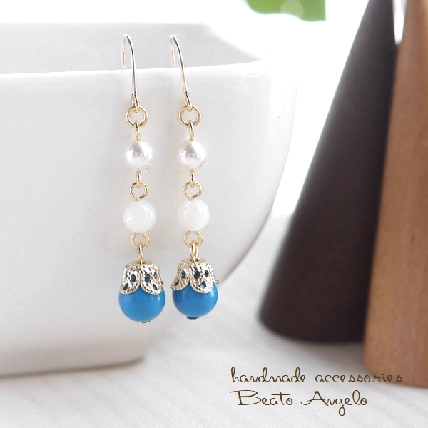 > ■+angelo+天然石ターコイズとマザーオブパール クリスタルのピアス(p-043)G ns003 ブルー 夏 チタン 樹脂 イヤリング