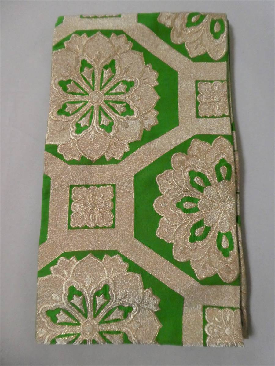 > ⑧和装 帯 袋帯 みどり 金 約30㎝×426㎝ 亀甲 モダン レトロ グリーンゴールド