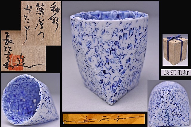 > 長江重和 ★ 釉彩薄層のかたち ★ 共箱 直筆共布 栞 ★ ぐい呑に見えますが細かな文様の連続で穴がありオブジェとして楽しむ逸品 ★